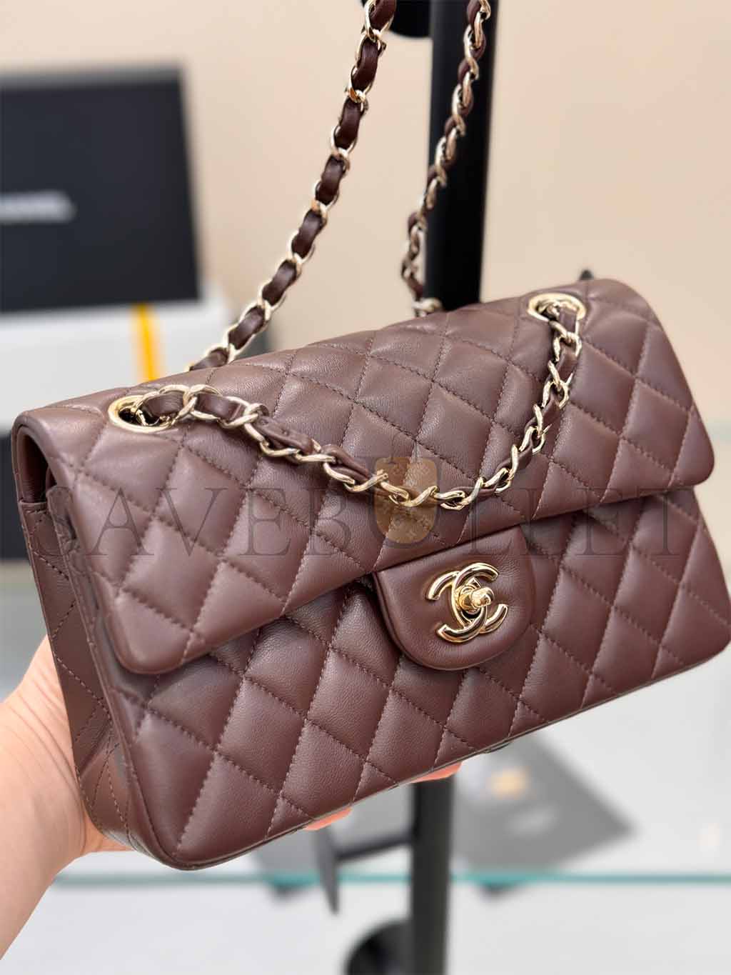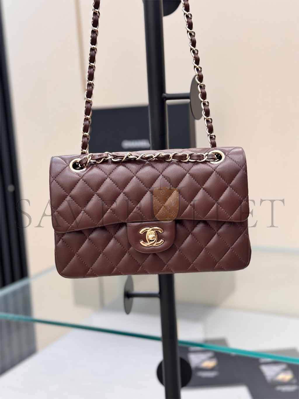 • CHANEL MASTER CLASSIC DOUBLE FLAP BAG DARK BROWN LAMBSKIN LIGHT GOLD HARDWARE AS1117 (23*14.5*6cm)