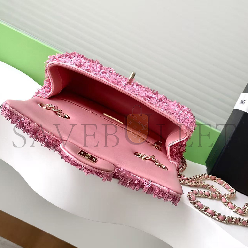 • CHANEL MINI CLASSIC RECTANGULAR FLAP BAG PINK TWEED AND SEQUIN GOLD HARDWARE 192410 (20*13*6cm)