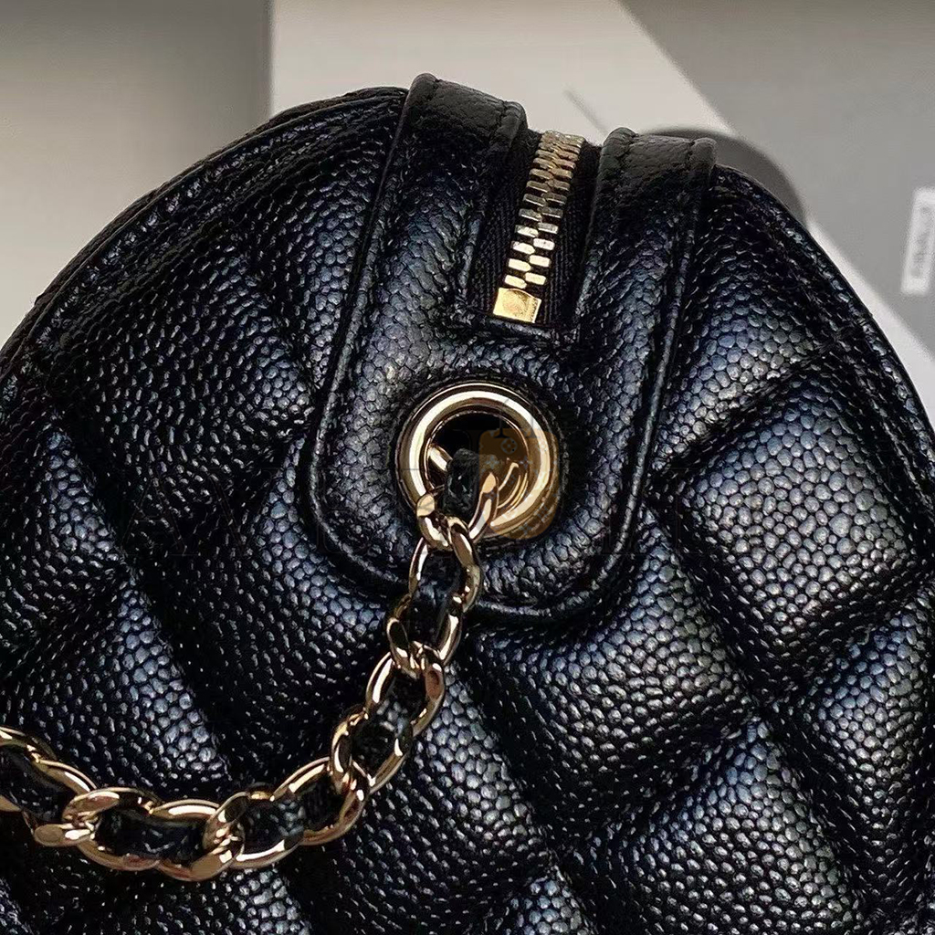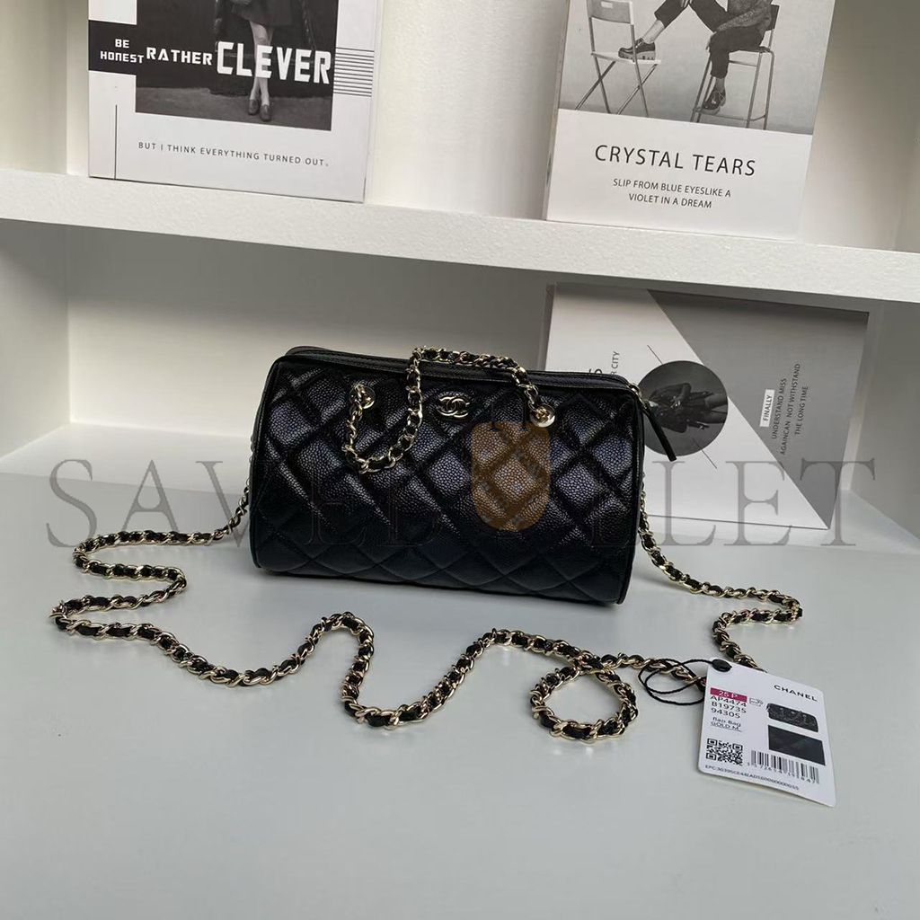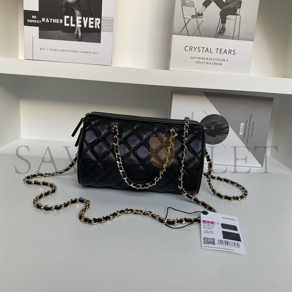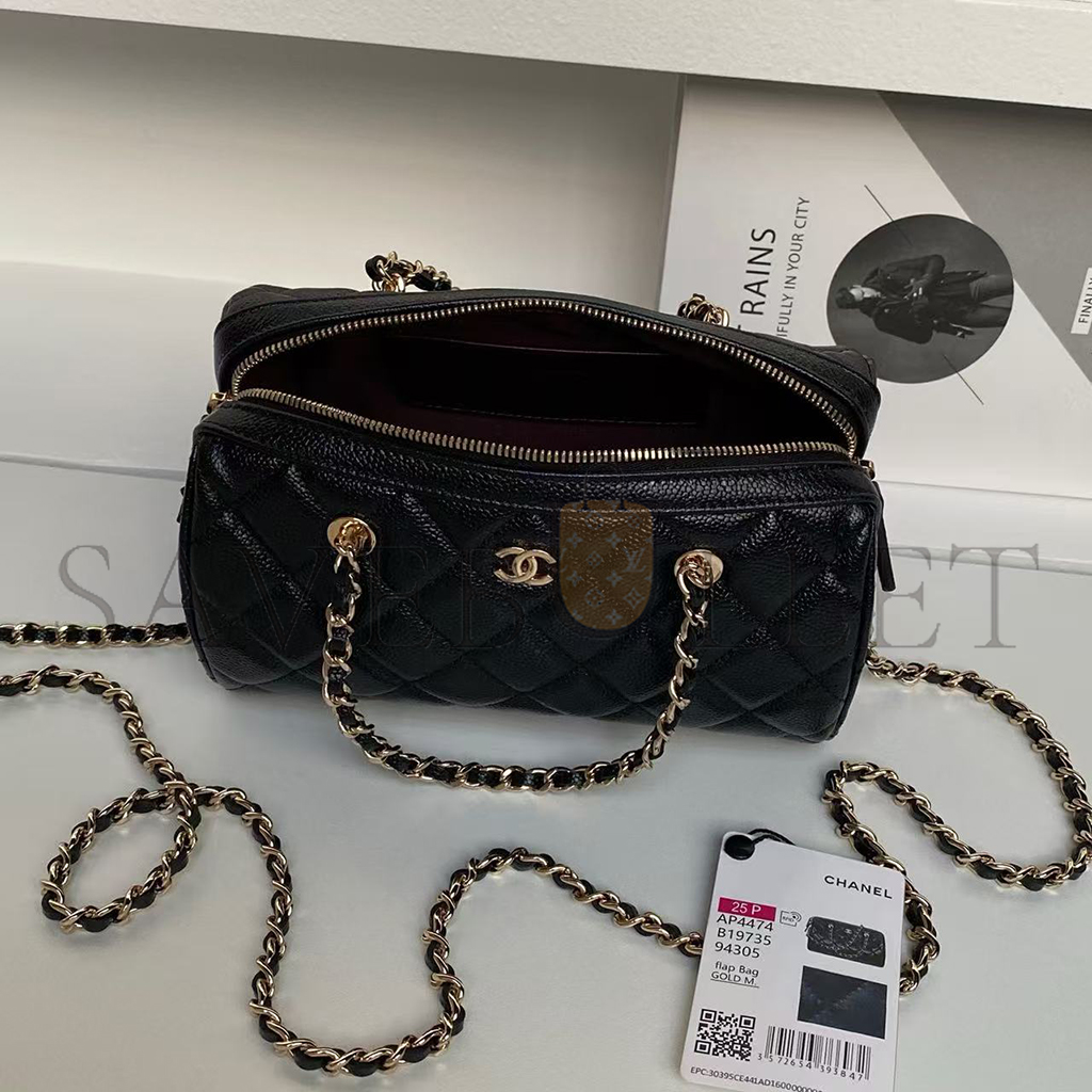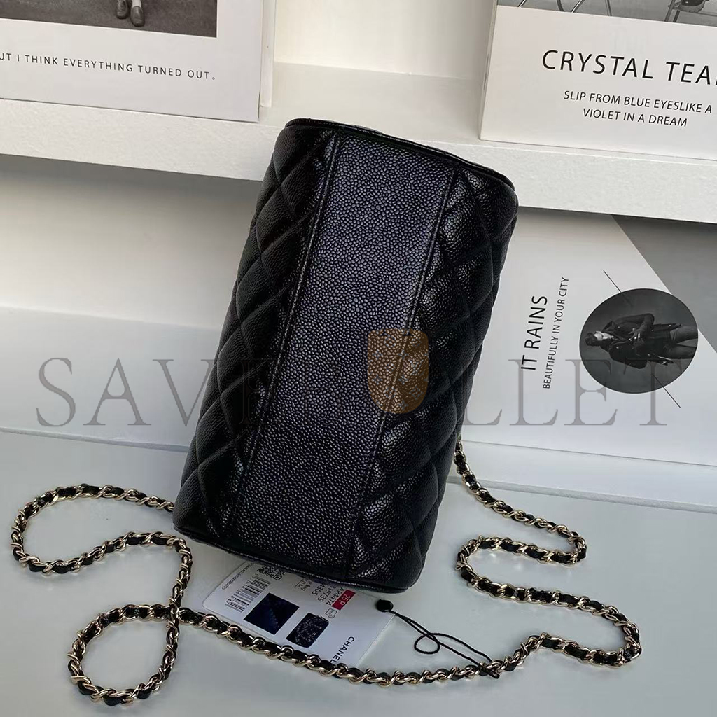CHANEL MINI TIMELESS CLASSIC BARREL BAG WITH CHAIN BLACK SHINY CAVIAR LIGHT GOLD HARDWARE AS0932 (18*13*10cm)