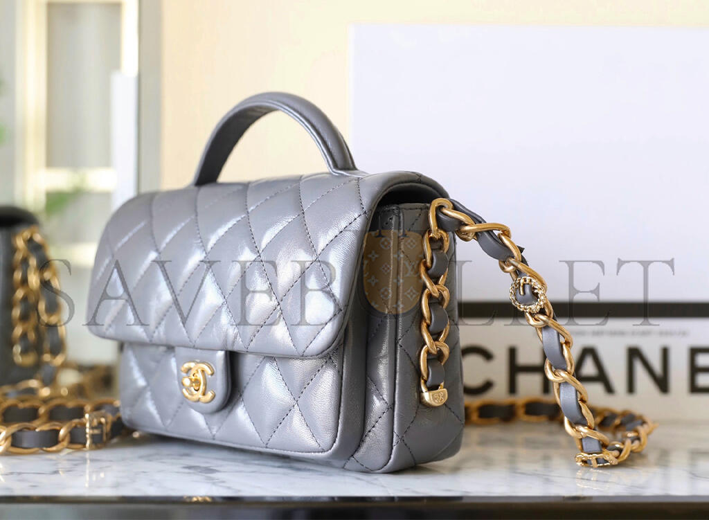 • CHANEL MASTER FLAP BAG WITH TOP HANDLE, SHINY LAMBSKIN GOLD-TONE METAL, GREY AS4992 (20*20*7cm)