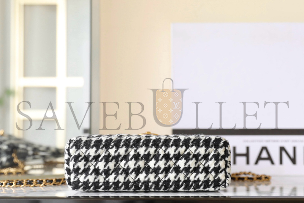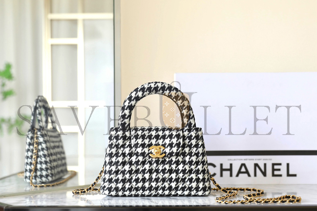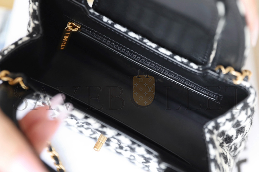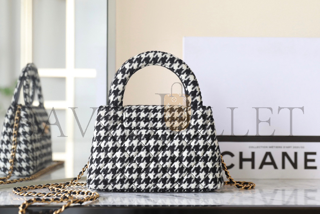 • CHANEL MASTER TWEED HOUNDSTOOTH QUILTED NANO KELLY SHOPPER BLACK WHITE AS4416 (19*13*7cm)